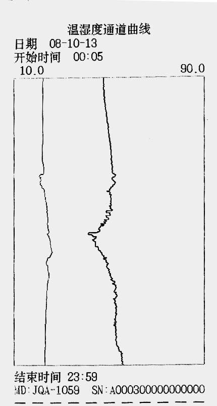 ● 圖中的曲線是每間隔5分鐘打印一次,一天24小時的溫濕度曲線。根據需要也可以只打印溫度或濕度曲線。
